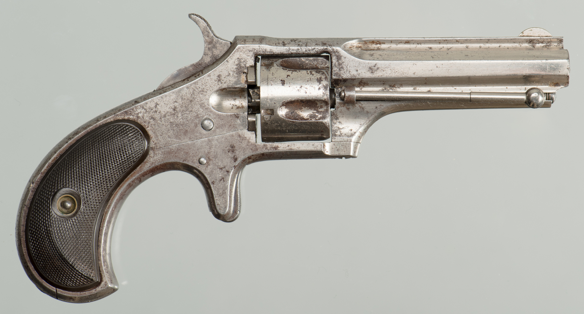 The New Model No. 2 upped the caliber to .32 Rimfire (but there are .30 Rimfire models as well). The .32 Rimfrie was a much more popular cartridge in this era. The .32 Rimfire cartridge was an 80-grain bullet that moved slowly but faster than the .30 Rimfire.